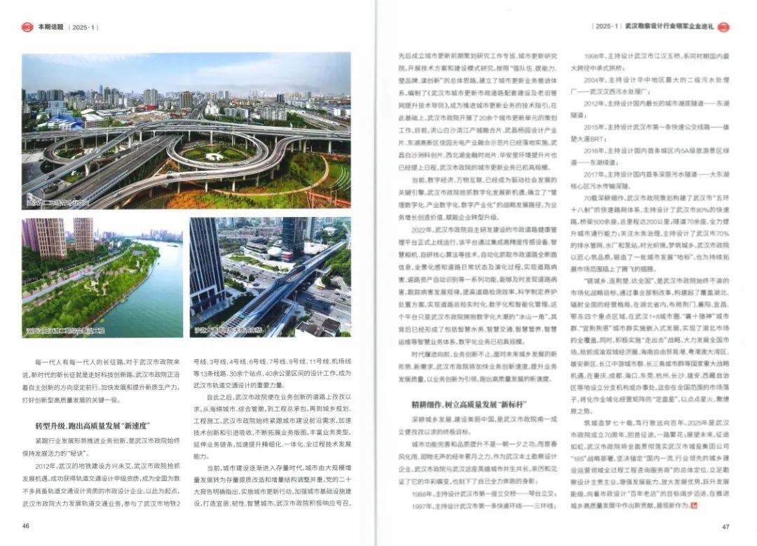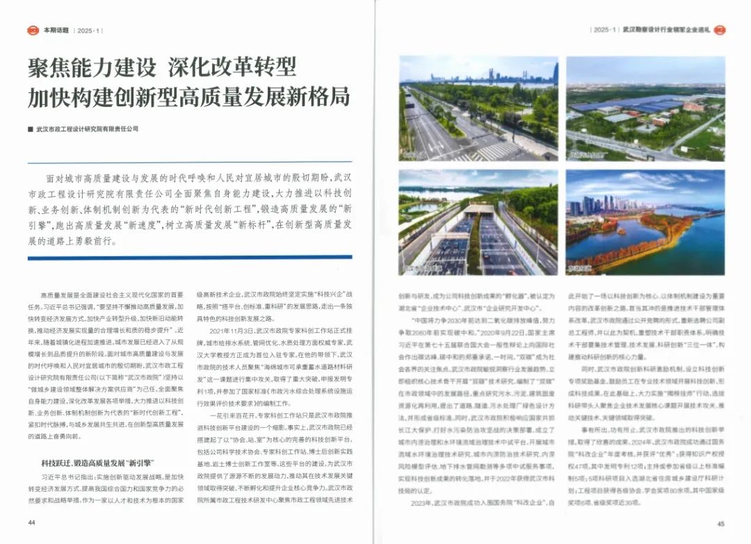 ? ? 近日,行業(yè)權(quán)威期刊《中國(guó)勘察設(shè)計(jì)》聚焦武漢勘察設(shè)計(jì)行業(yè),對(duì)領(lǐng)軍企業(yè)進(jìn)行了專題報(bào)道。其中,武漢市政工程設(shè)計(jì)研究院有限責(zé)任公司(以下簡(jiǎn)稱“武漢市政院”)以“聚焦能力建設(shè),深化改革轉(zhuǎn)型,加快構(gòu)建創(chuàng)新型高質(zhì)量發(fā)展新格局”為主題,分享了其在新時(shí)代背景下的創(chuàng)新實(shí)踐和發(fā)展成果,展示了企業(yè)在高質(zhì)量發(fā)展道路上勇毅前行的風(fēng)采和活力,引發(fā)了行業(yè)廣泛關(guān)注。
