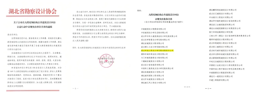 近日,湖北省勘察設(shè)計(jì)協(xié)會發(fā)布《關(guān)于公布在大跨度鋼結(jié)構(gòu)公共建筑設(shè)計(jì)回訪公益行動中表現(xiàn)突出單位名單的通報(bào)》,武漢市政院憑借高度的社會責(zé)任感與卓越的專業(yè)貢獻(xiàn),榮列通報(bào)表揚(yáng)名單,成為全省勘察設(shè)計(jì)行業(yè)的標(biāo)桿典范。