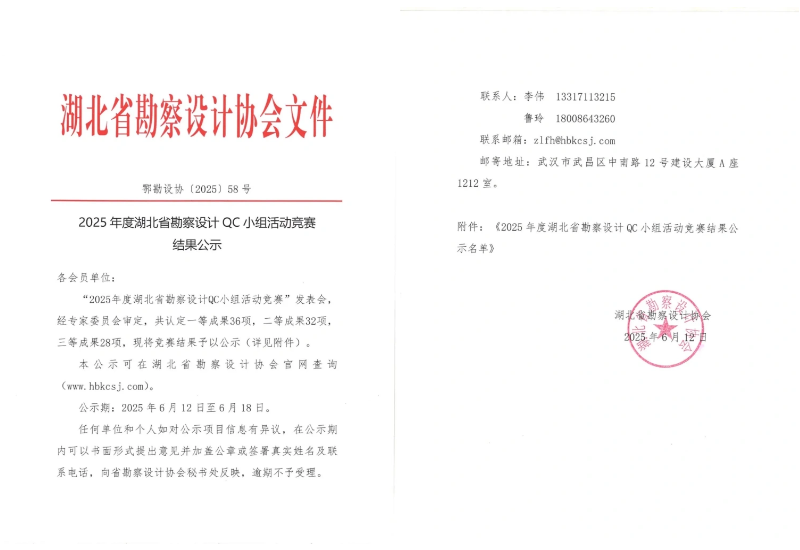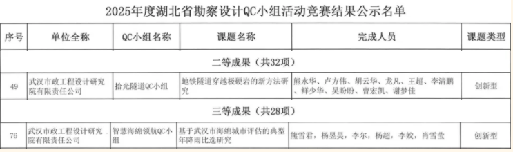 武漢市政院再傳捷報!近日,湖北省勘察設計協(xié)會組織召開的“2025 年度湖北省勘察設計QC小組活動競賽”中,武漢市政院選送的兩個QC小組表現亮眼:地空事業(yè)部"拾光隧道QC小組"憑借創(chuàng)新成果斬獲競賽二等獎,規(guī)劃研究事業(yè)部"智慧海綿領航QC小組"榮獲三等獎佳績。
