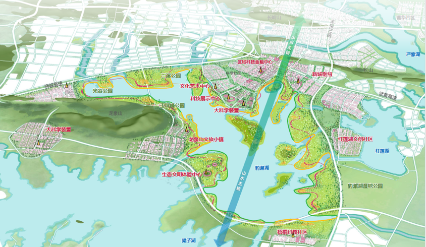 ? ? 豹澥湖位于武漢新城的山水景觀主軸,是武漢新城構(gòu)建“看山望水、疏朗通透”景觀視廊體系的重要節(jié)點,也是武鄂黃黃核心區(qū)南部湖區(qū)生態(tài)空間的重要組成部分,是大江大湖群山富集之地,流域的系統(tǒng)化治理也是推動武鄂黃黃一體化建設(shè)的關(guān)鍵性實踐。以科學島為核心的環(huán)豹澥湖科創(chuàng)圈已初具規(guī)模,豹澥湖流域?qū)⑹俏錆h新城區(qū)域內(nèi)未來最具發(fā)展?jié)摿Φ暮诵膮^(qū)。