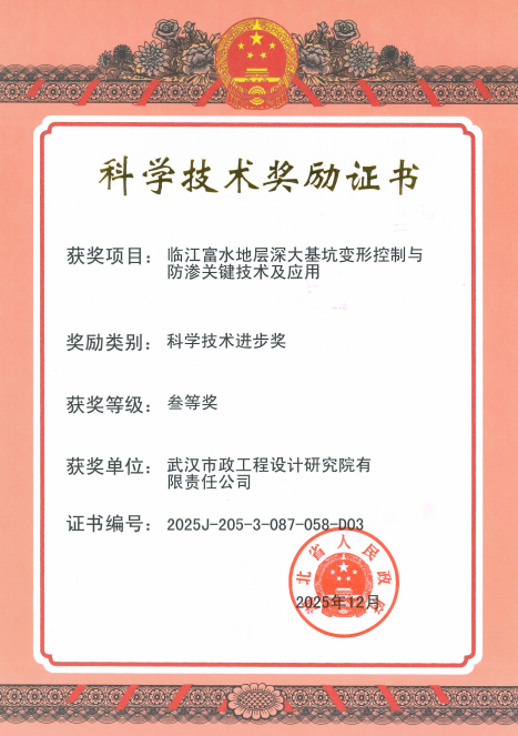 近日,2025年度湖北省科學(xué)技術(shù)獎獲獎名單正式公布。由武漢市政院深度參與研發(fā)的科研項目“臨江富水地層深大基坑變形控制與防滲關(guān)鍵技術(shù)及應(yīng)用”,憑借顯著的技術(shù)創(chuàng)新性與突出的工程應(yīng)用價值,榮獲湖北省科學(xué)技術(shù)進步三等獎。