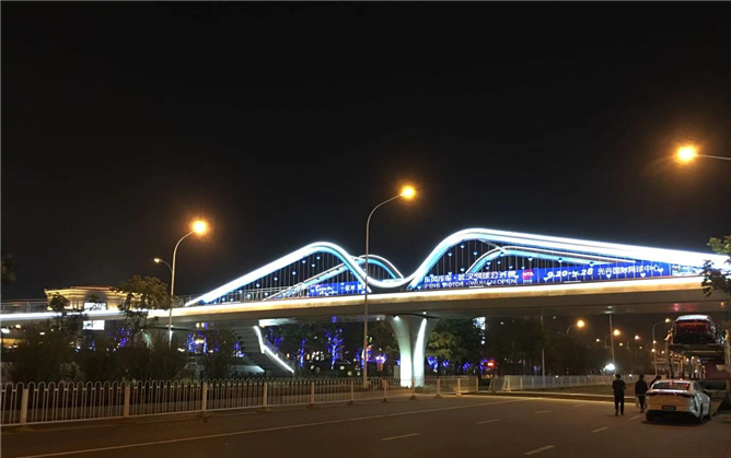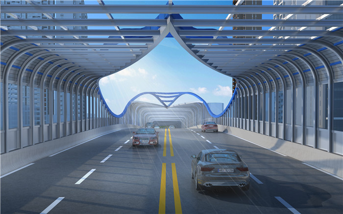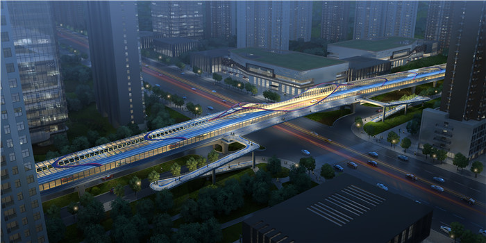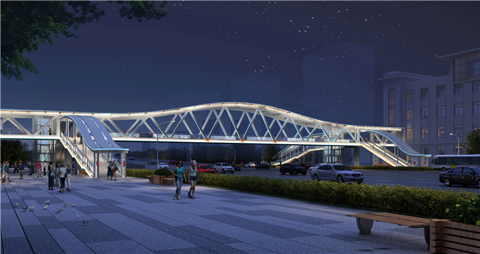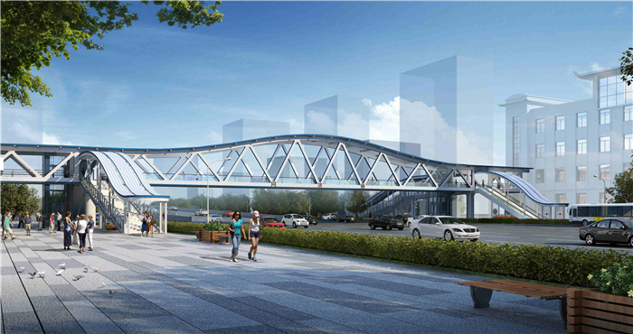 銀灰色和淡藍(lán)色相間勾勒流暢優(yōu)美的桁架拱橋曲線線條,將建筑美學(xué)和結(jié)構(gòu)美學(xué)有機(jī)結(jié)合在一起,色彩清新典雅,連續(xù)人字形鋼桁架顯示橋梁結(jié)構(gòu)的力量美。