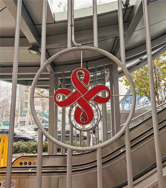 在天橋梯道及自動扶梯入口處、橋下休憩區(qū)設(shè)計(jì)醒目的紅色標(biāo)識,將中國結(jié)與紅十字融為一體,象征博愛、奉獻(xiàn)精神的白衣天使與武漢人民永結(jié)同心,中國結(jié)寓意著美好、吉祥、安康。