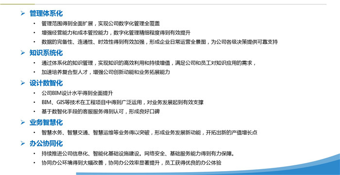 信息中心對《公司2021-2023年數(shù)字化建設發(fā)展綱要》進行了宣貫。近年來,公司緊跟行業(yè)發(fā)展形勢,立足公司實際需要,開展了以日常運營、項目管理、智慧平臺、移動辦公等為主要內(nèi)容的數(shù)字化建設工作,取得了積極成效。《綱要》立足當前公司數(shù)字化發(fā)展需求,提出了管理體系化、知識系統(tǒng)化、設計數(shù)智化、業(yè)務智慧化、辦公協(xié)同化五個方面的發(fā)展目標,明確了各方面的建設內(nèi)容及相關(guān)組織保障。