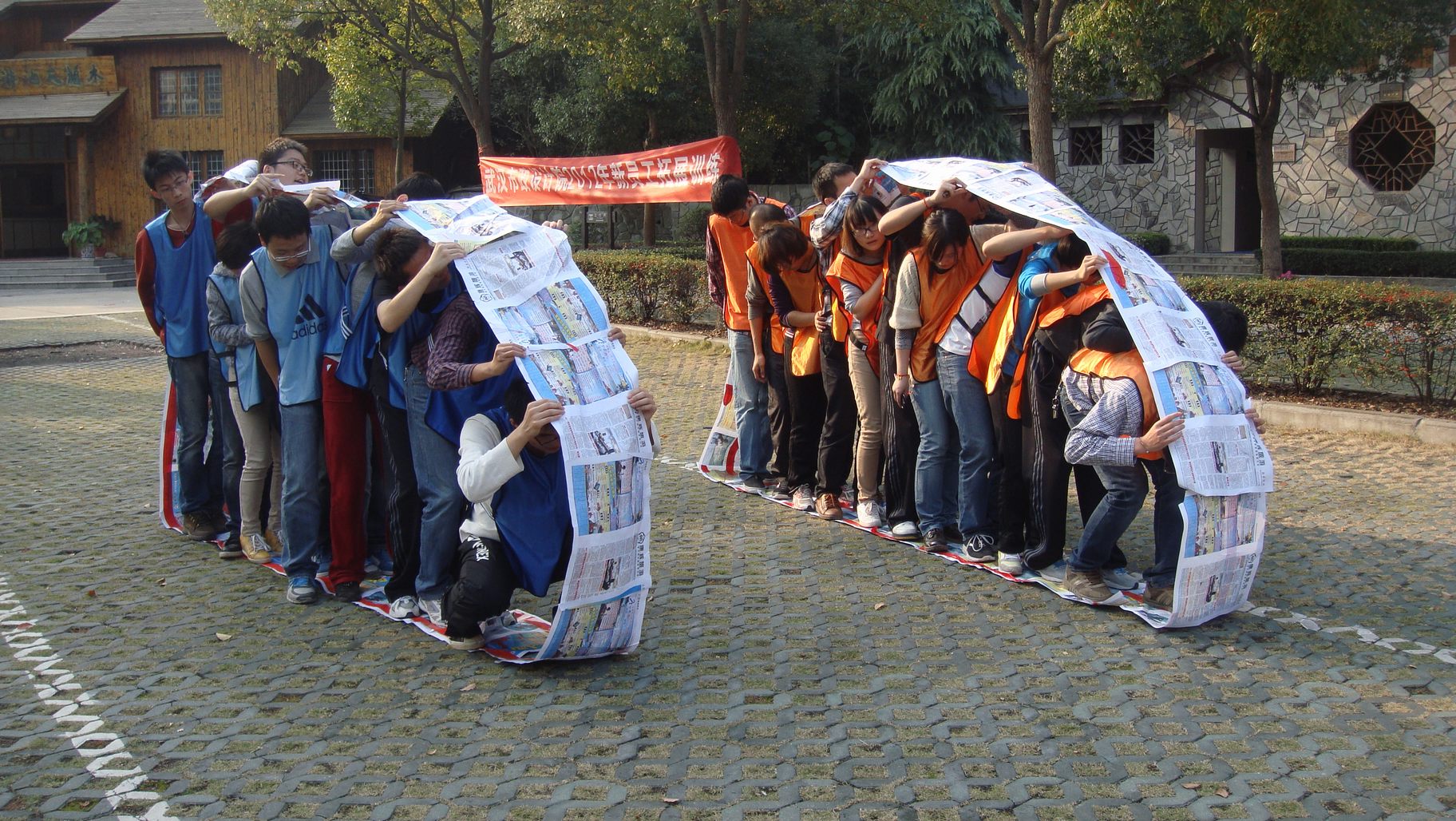 ??? 當(dāng)天下午,在進(jìn)行簡(jiǎn)單破冰之后,新員工分成兩隊(duì)進(jìn)行團(tuán)隊(duì)項(xiàng)目活動(dòng),兩隊(duì)隊(duì)員團(tuán)結(jié)一心,各獻(xiàn)奇計(jì),制作出本隊(duì)的隊(duì)旗,選定了本隊(duì)的口號(hào)和對(duì)歌,為團(tuán)隊(duì)項(xiàng)目的開(kāi)展打好了基礎(chǔ)。在“履帶戰(zhàn)車(chē)”這個(gè)項(xiàng)目中,兩隊(duì)隊(duì)員開(kāi)動(dòng)腦筋,利用報(bào)紙和膠帶拼接成了滾動(dòng)的履帶,隊(duì)員們統(tǒng)一協(xié)作,在有節(jié)奏的口號(hào)聲中推動(dòng)“履帶”前行,體驗(yàn)到了“統(tǒng)一聯(lián)動(dòng)”和“萬(wàn)眾一心”在團(tuán)隊(duì)中的重要作用。