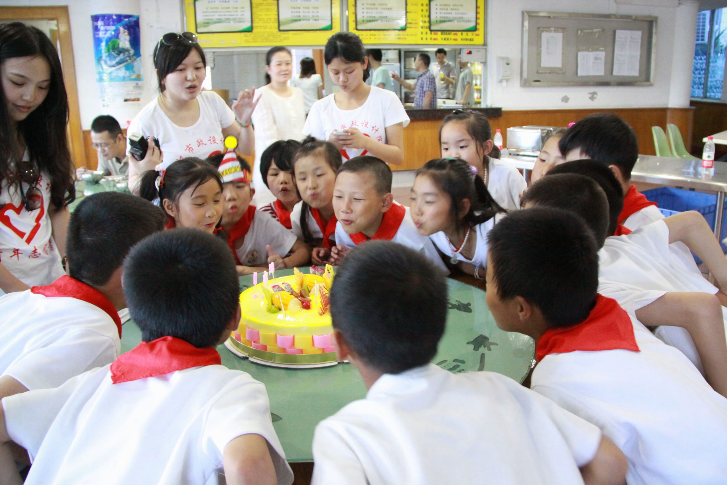 ??? 結(jié)束了一天的行程,志愿者與孩子們回到公司吃晚飯,孩子們有秩序的排隊領(lǐng)取晚餐,吃的干干凈凈。這時,志愿者們端出了準(zhǔn)備好的蛋糕,為這群7-9歲的孩子們過一個集體生日,大家唱著生日歌,一起吹滅了蠟燭。志愿者們將蛋糕分發(fā)給每一個孩子,他們吃的津津有味。