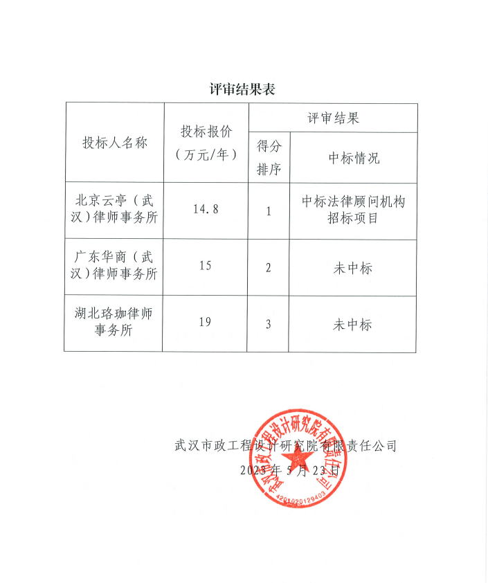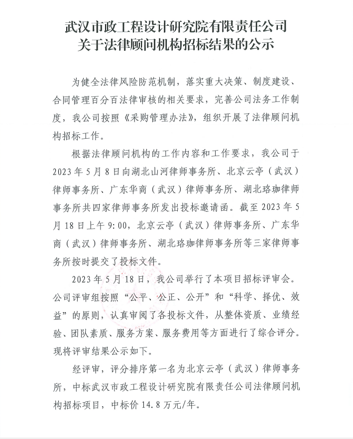 武漢市政工程設(shè)計研究院有限責(zé)任公司關(guān)于法律顧問機構(gòu)招標結(jié)果的公示