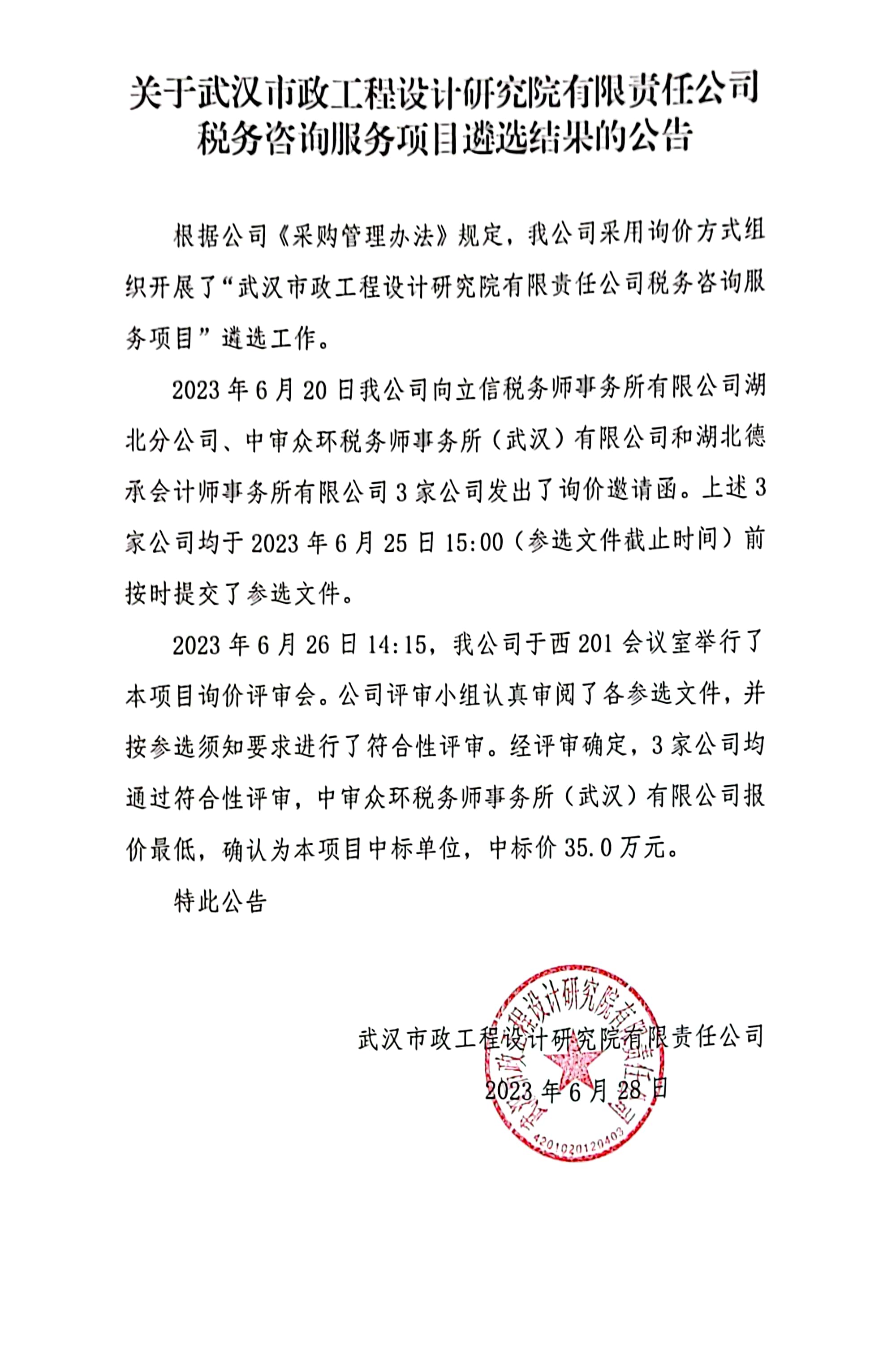 關(guān)于武漢市政工程設(shè)計研究院有限責(zé)任公司稅務(wù)咨詢服務(wù)項目遴選結(jié)果的公告