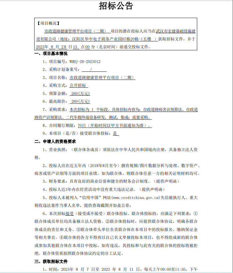 市政道路健康管理平臺(tái)項(xiàng)目(二期)招標(biāo)公告